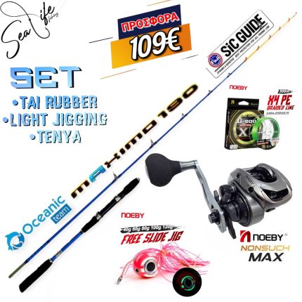 Το Σετ Περιλαμβάνει:-Καλάμι Oceanic Tai Cast 2.00m c.w 60-150gr -Μηχανισμό NOEBY LEISURE X5 Max Drag: 15kg-Νήμα NOEBY G-SOUL x4 300m Light Green-1 Tai