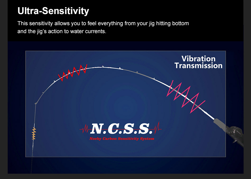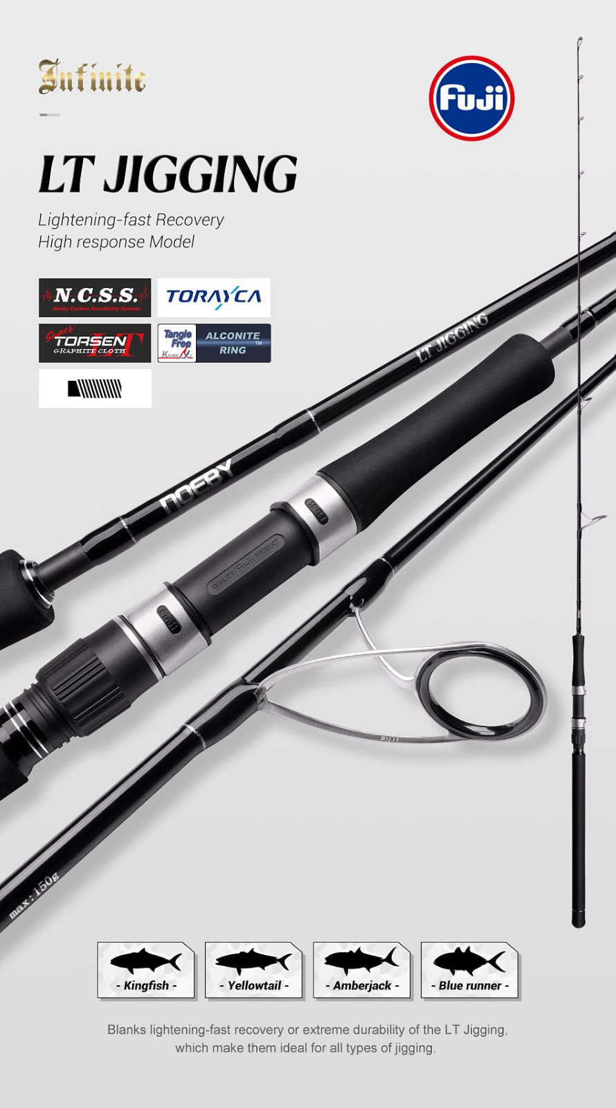 Νέο Καλάμι LT Jigging από την εταιρεία NOEBY κατασκευασμένο από TORAYCA Carbon 99% και τεχνολογίες TORSEN – POWER X -N.C.S.S κάνουν το καλάμι εξαιρετικά δυνατό έτοιμο να τα βάλει με μεγάλους θηρευτές με ευκολία. Κατάλληλο για να χρησιμοποιούμε πλάνους, σιλικόνες, μεγάλα popper και pencil δίνοντας μας απόλυτη αίσθηση και έλεγχο του τεχνητού μας δολώματος. Αρματωμένο με 7+1 Fuji Alconite οδηγούς εξασφαλίζοντας ομαλή και χωρίς τριβές κατανομή του νήματος μας.Βάση μηχανισμού Fuji heavy duty DPS – LD REEL SEAT.