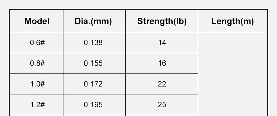 | Διάμετρος | PE 0.6# / 0.138mm / 14lb, PE 0.8# / 0.155mm / 16lb, PE 1.0# / 0.172mm / 22lb, PE 1.2# / 0.195mm / 25lb |
