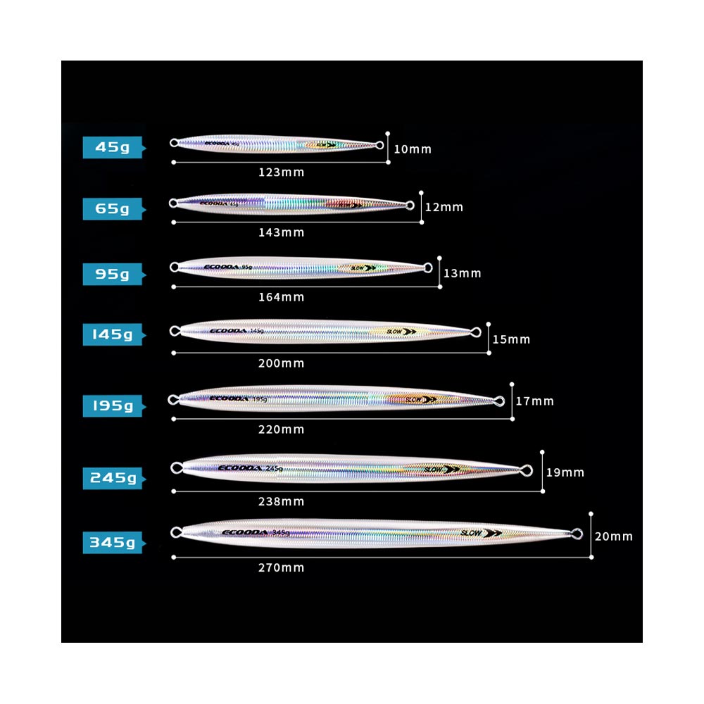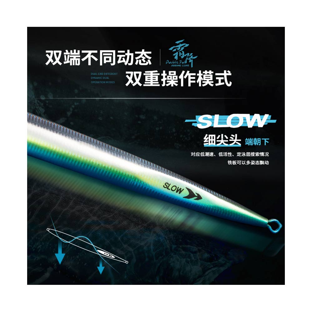 A comprehensive metal lure with original shape design. Two asymmetrical ends provide a speed and slow dynamics. 1:3 center of gravity and special shape make the jigging fishing more varied. Wide and round end down for high current speed, high activity and long distance search. The metal bait can sink quickly and jig lightly. Slow thin and sharp end down for slow current speed, low activity and aimed water search. The metal bait can move in multiple positions.