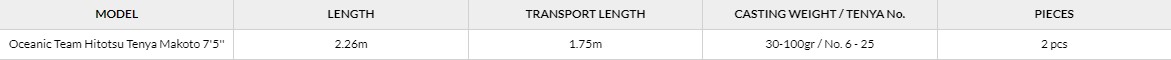 Η Oceanic Team εισέρχεται σε μια νέα κατηγορία καλαμιών για την τεχνική του Hitotsu Tenya με τέσσερις διαφορετικές προτάσεις! Το Makoto 7’5’’ είναι η heavy πρόταση με best match lure weight 30-100gr και 2.26m μήκος ενώ παράλληλα πληρεί όλες τις προδιαγραφές που πρέπει να έχει ένα καλάμι Hitochu Tenya. Σε αντίθεση με τις πιο light εκδόσεις, το Makoto 7’5’’ δεν διαθέτει κάποιου τύπου έξτρα solid ή tubular κορυφή και είναι ένα ενιαίο ασύμμετρο δίσπαστο καλάμι ώστε το blank του καλαμιού να βγάζει όλη την δύναμη του στην μάχη με το ψάρι. Παρόλο που δεν διαθέτει έξτρα κορυφή, η συμπεριφορά του καλαμιού έχει σχεδιαστεί ώστε να μας δίνει ένδειξη ακόμα και τις πιο επιφυλακτικής τσιμπιάς ενώ παράλληλα η μεγάλη ταχύτητα επαναφοράς δίνει άμεσο κάρφωμα. Πραγματικά εξαιρετικής ποιότητας και Heavy δράσης Blank, απευθύνεται σε όσους θέλουν να εφαρμόσουν την τεχνική με στόχο τα μεγάλα «κόκκινα» και σε βαθιά νερά. Αποσβένει τα κεφάλια του ψαριού και το κουράζει εύκολα ενώ μας δίνει την δυνατότητα να ψαρέψουμε με ευρεία γκάμα διαφορετικών μεγεθών Hitochu Tenya δολωμάτων, σε διαφορετικά βάθη και για διάφορα είδη ψαριών. Το «best match lure weight» σημαίνει ότι το καλάμι αποδίδει καλύτερα σε αυτό το εύρος γραμμάριων αλλά μπορεί να δουλέψει και μεγαλύτερα ή μικρότερα Hitochu Tenya. Ένα ποιοτικό καλάμι, με βάρος 175γρ και σχεδιασμένο για να αναζητήσουμε με Tenya… μεγάλες μάχες & μεγάλες συγκινήσεις!!