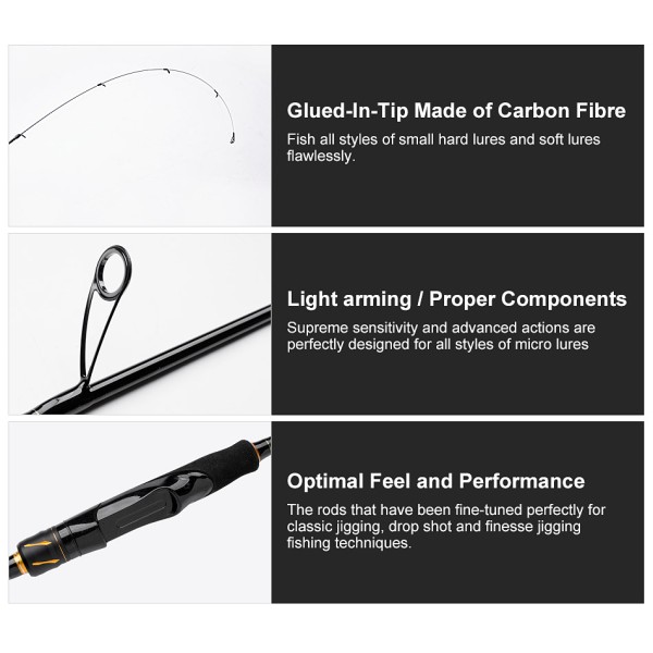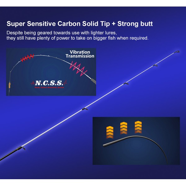 Χαρακτηριστικό του καλαμιού είναι η solid fiber carbon Μύτη του που βοηθάει να έχουμε τέλεια αίσθηση σε όλους τους τύπους τεχνιτών από micro jigs(μικρά πλανάκια), μικρά popper, βιοδυασπόμενα, σιλικονάκια, μικρά minnows αλλά και μικρές καλαμαριέρες στοχεύοντας σε σουπιές και πονηρεμένα καλαμάρια.