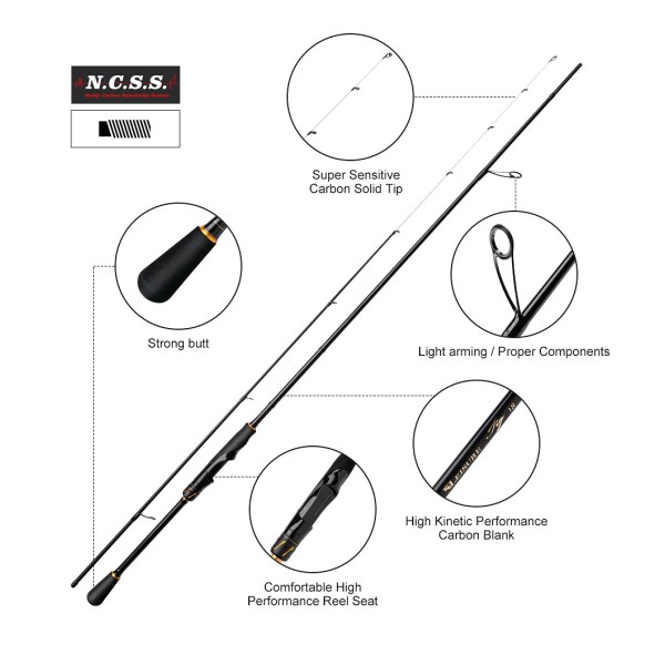 Κατασκευασμένο εξολοκλήρου με τεχνολογία N.C.S.S (noeby carbon sensitivity system) και τα δύο τρίτα του καλαμιού είναι πολύ πιο άκαμπτα ώστε να διατηρούν την δύναμη του καλαμιού απέναντι σε μεγάλους θηρευτές.