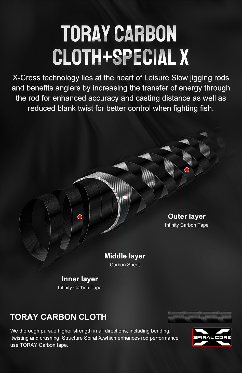 Το καλάμι συνδυάζει άνθρακα υψηλής ποιότητας από την Ιαπωνική Toray και νάνο σύνθετο υλικό, εσωτερική κατασκευή από μετάξι και άνθρακα από την SPIRAL X, που οδηγεί σε υψηλή αντοχή του καλαμιού, ιδιαίτερη ελαστικότητα και ανθεκτικότητα με ευαίσθητο σήμα προς τα κάτω.