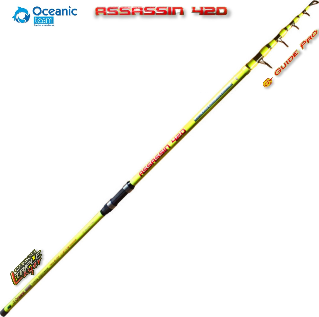 Με άκρως εντυπωσιακή εμφάνιση αλλά και χαρακτηριστικά που δύσκολα βρίσκουμε σε καλάμι με τόσο χαμηλό κόστος το νέο Oceanic Assasin, ήρθε για να προικίσει την φαρέτρα κάθε έμπειρου Surfer αλλά και να αποτελέσει την καλύτερη επιλογή για κάθε νέο. Κατασκευασμένο από υψηλής πυκνότητας άνθρακα (High Modulus Carbon) αλλά και σχεδιασμένο για να εξασφαλίζει βολές μεγάλων αποστάσεων, το Assassin θα σας γοητεύσει με το πρώτο άγγιγμα. Η εταιρεία Oceanic θέλησε να δώσει μεγάλη βαρύτητα και στους οδηγούς του νέος Assassin και για τον λόγο αυτό το έντυσε με την σειρά Guide Pro. Με την σειρά Guide Pro είναι δεδομένο ότι η ροή της πετονιάς ή του νήματος αυξάνετε σε υψηλά επίπεδα, συμβάλλοντας σε ακόμα μεγαλύτερες βολές. Παράλληλα προσφέρει άριστη διαχείριση αλλά και προστασία από τις φθορές που δημιουργούνται κατά την βολή ή την ανάκτηση. Τέλος το υψηλό όριο θραύσης, μας προσφέρει εξαιρετικές αντοχές ακόμα και σε πολύ υψηλά φορτία.