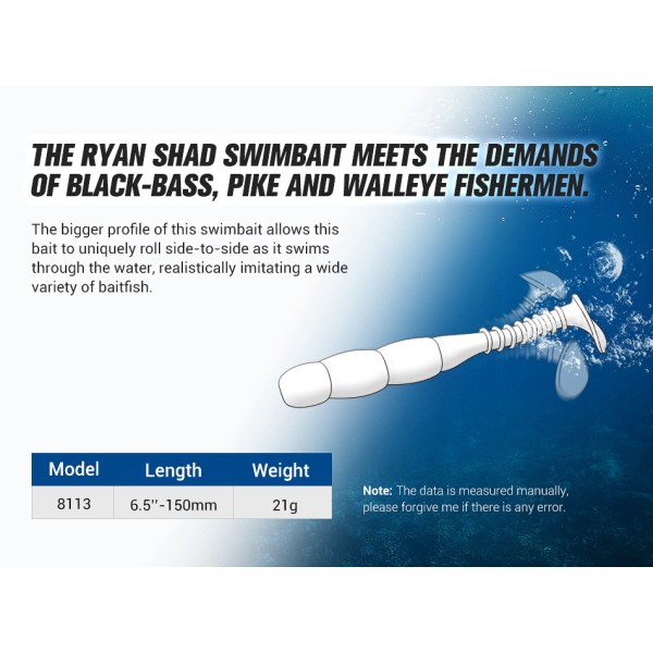Το Ryan Shad Swimbait είναι μία ρεαλιστική σιλικόνη σχεδιασμένη για απαιτητικούς ψαράδες που στοχεύουν λαβράκια, λούτσους,συναγριδες,στύρες κ.α. Ο συνδυασμός μεγάλου προφίλ, έντονης κίνησης και ισχυρού αρώματος γαρίδας το καθιστά εξαιρετικά αποτελεσματικό ακόμα και σε δύσκολες συνθήκες.