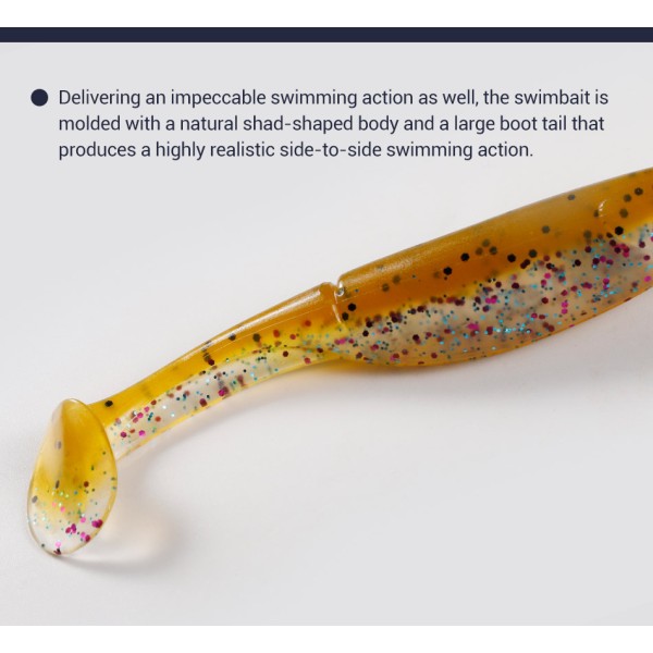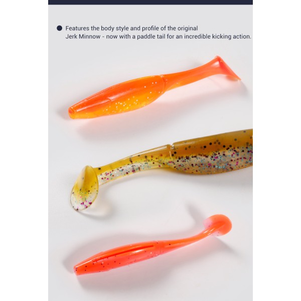 Διαθέτει σώμα σε φυσικό σχήμα ψαριού (shad) και μεγάλη ουρά τύπου boot tail, η οποία δημιουργεί έντονη πλευρική κίνηση και δονήσεις, προσελκύοντας αρπακτικά ακόμα και σε δύσκολες συνθήκες. Η ισορροπημένη του σχεδίαση εξασφαλίζει σταθερή πλεύση.
