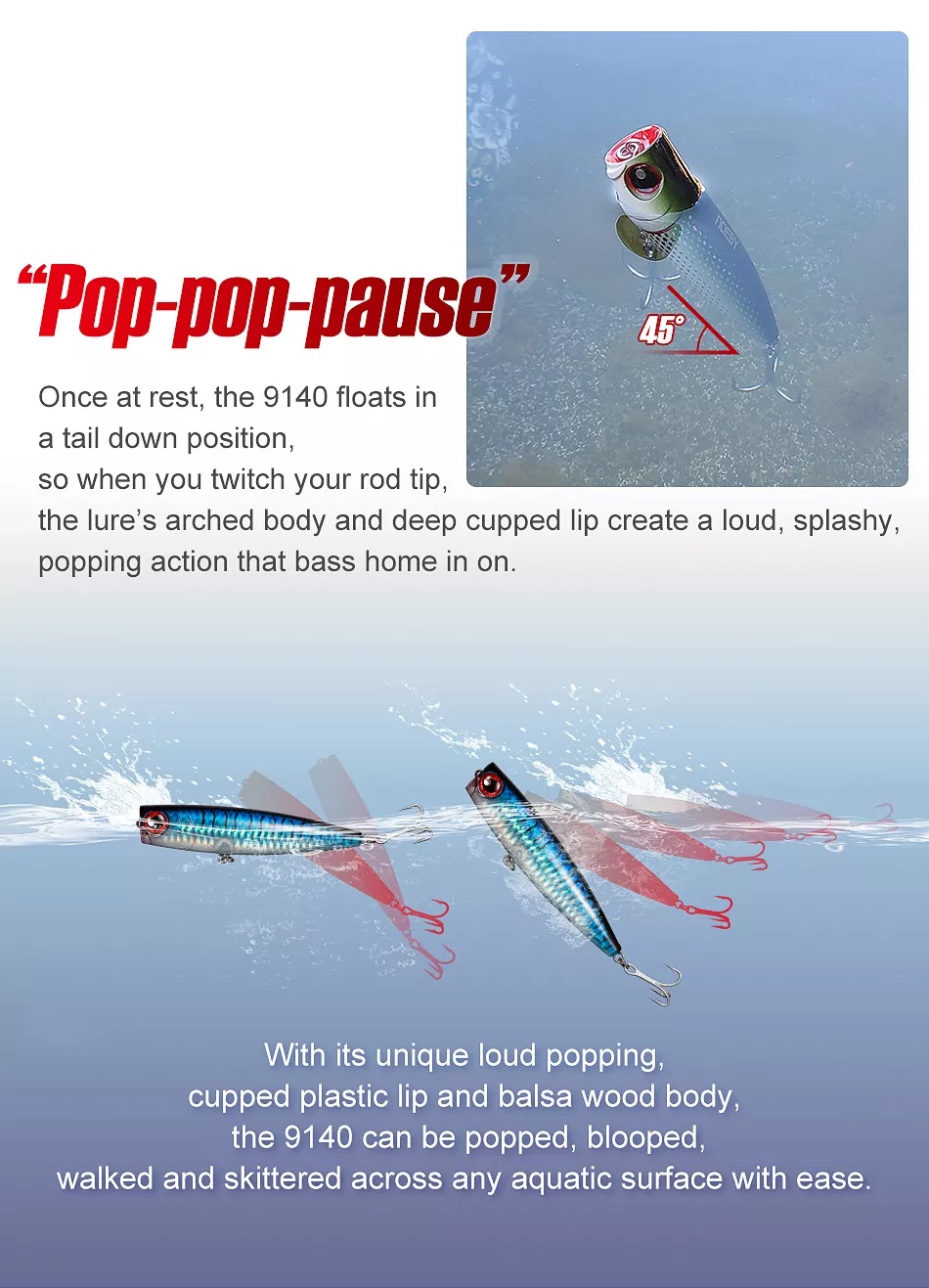 Στην παύση της ανάκτησης παίρνει κλήση 45 μοιρών ενώ στην επανεκκίνηση οριζοντιόνεται δημιουργώντας θόρυβο και παφλασμό στην επιφάνια του νερού προσελκύοντας ψάρια ακόμη και σε μακρινή απόσταση.