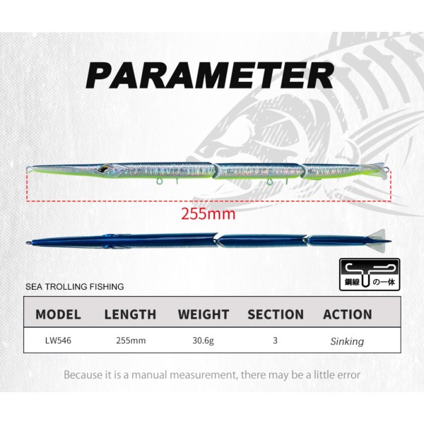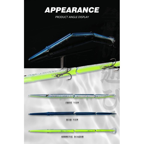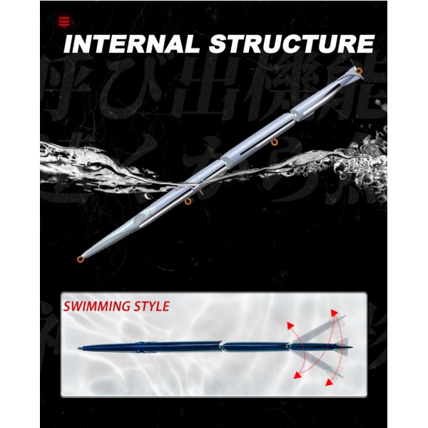Το Phantom 255S Jointed είναι ένα βυθιζόμενο τεχνητό δόλωμα αρθρωτής κατασκευής τριών τμημάτων, σχεδιασμένο για απόλυτα ρεαλιστική προσομοίωση ζαργάννας, με έντονη S-κίνηση και φυσική πλευρική ταλάντωση ακόμη και σε πολύ χαμηλές ταχύτητες ανάκτησης. Το αρθρωτό σώμα επιτρέπει μεγάλη γωνία άρθρωσης, δημιουργώντας έντονα υδροδυναμικά σήματα και μικροδονήσεις που γίνονται άμεσα αντιληπτές από το πλευρικό αισθητήριο των αρπακτικών. Με μήκος 255 mm και βάρος 30.6 g, παρουσιάζει εξαιρετική αεροδυναμική συμπεριφορά, προσφέροντας μακρινές και σταθερές βολές ακόμη και σε συνθήκες ανέμου, ενώ η κατανομή βάρους εξασφαλίζει σωστή στάση στο νερό και άμεση έναρξη πλεύσης με το πρώτο γύρισμα του μηχανισμού. Η ειδικά σχεδιασμένη ουρά τύπου paddle tail ενισχύει την ώθηση και τη δόνηση, διατηρώντας σταθερή τροχιά τόσο σε γραμμική ανάκτηση όσο και σε τεχνικές stop-and-go, jerking και twitching. Το Anti-Tangle Hook System περιορίζει αποτελεσματικά τις εμπλοκές των αγκιστριών κατά τη βολή και την πλεύση, αυξάνοντας την αξιοπιστία σε δυναμικά ψαρέματα, ενώ οι ενισχυμένες σαλαγκιές προσφέρουν άριστη διατρητικότητα, αντοχή σε διάβρωση και υψηλό ποσοστό καρφώματος ακόμη και σε επιθετικά χτυπήματα μεγάλων θηρευτών. Η στιβαρή κατασκευή και τα ρεαλιστικά φινιρίσματα καθιστούν το Phantom 255S Jointed ιδανικό εργαλείο για στοχευμένο ψάρεμα μεγάλων αρπακτικών, όπως λούτσοι, γοφάρια, λίτσες, μαγιάτικα και λαβράκια, τόσο από ακτή όσο και από σκάφος, σε τεχνικές shore game και offshore spinning υψηλών απαιτήσεων.
