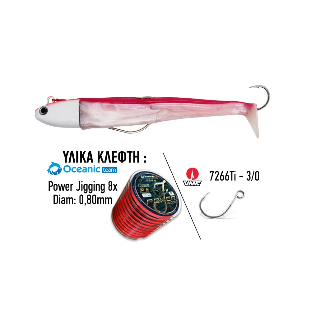 Έτοιμα σετ 6 combo Ocean Ruler σε κασετίνα τεχνητών 21x17x5cm για όσους δεν θέλουν να μπουν στην διαδικασία να βάλουν κλέφτη. Οι σιλικόνες είναι αρματωμένες με κλέφτη στην ούρα με αγκίστρι VMC 7266Ti – 3/0 και νήμα Power Jigging 8x – 0,80mm, συν την κασετίνα. Τα Combo είναι επιλεγμένα με διάφορα jigheads (80,100,125 & 150gr) και διάφορους χρωματισμούς σωμάτων ώστε να καλύψουν όλες τις ανάγκες σας!