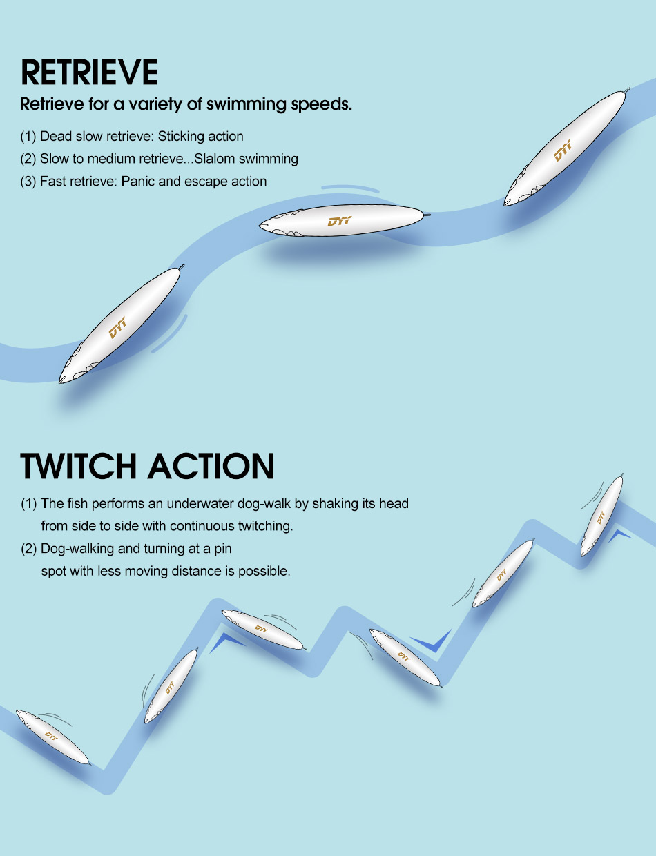 Νέο Sinking Pencil της εταιρείας DYY 90mm/24.5gr μπορεί να πιάσει τις αποστάσεις ενός πλάνου αλλά με συμπεριφορά και κινήσεις που ένας πλάνος δεν μπορεί να κάνει. Μία από τις κινήσεις αυτές είναι κατά την ελεύθερη βύθιση του τεχνητού οπού εκτελεί σε οριζόντια θέση rolling όπως ακριβώς βυθίζεται ένα ετοιμοθάνατο και χτυπημένο μικρό ψάρι. To ιδιαίτερο σχήμα του κεφαλιού surface και το χαμηλό κέντρο βάρους του μας δίνουν την δυνατότητα για απίστευτα πολλές και διαφορετικές πλεύσεις, από αργή έως και γρήγορη ανάκτηση. Έτσι λοιπόν, το jerking και το skipping επιτυγχάνεται με μεγάλη ευκολία, προσελκύοντας όλα τα πελαγικά είδη ασχέτου μεγέθους!!