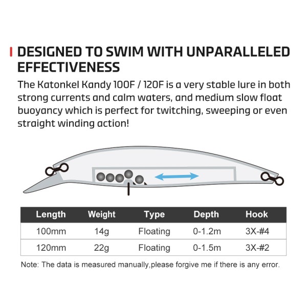 Το Noeby Katonkel Kandy είναι ένα από τα πιο αποδοτικά  τεχνητά της κατηγορίας του. Σχεδιασμένο με ακρίβεια για να προσφέρει φυσική πλεύση και έντονη ελκυστικότητα, είναι ιδανικό τόσο για δυνατά ρεύματα όσο και για ήρεμα νερά. Εξαιρετική ισσοροπιμένη πλεύση με μέτρια αργή αλλά και γρήγορη ανάκτηση που το κάνει ιδανικό για twitching, jerking και