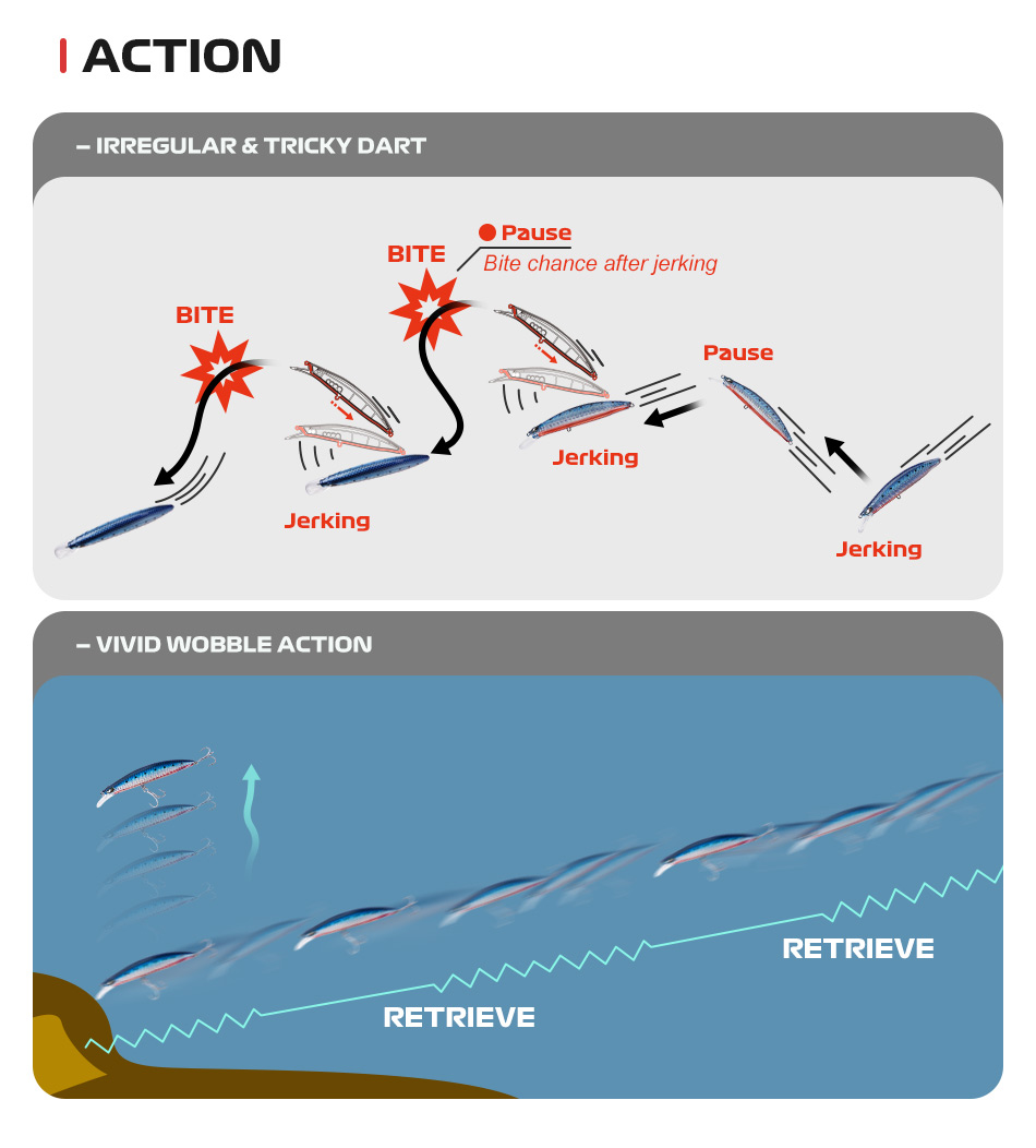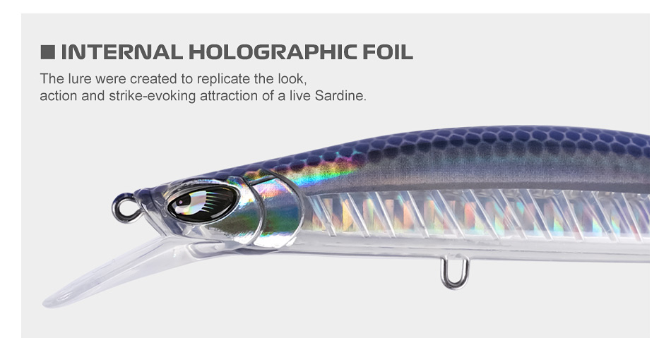 Ειδικός σχεδιασμός σώματος και γλώσσας δίνουν στο minnow ισορροπημένη πλέυση και εντελώς αληθοφανή κίνηση που μιάζει με τραυματισμένο μικρόψαρο.