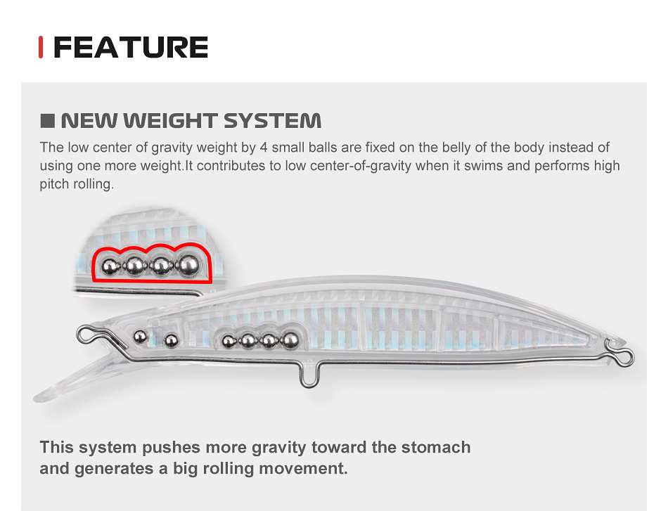 Εσωτερικό Σύστημα μετακίνησης βάρους με 3 σφαιρίδια εξασφαλίζοντας μας ταλαντευόμενη και ισορροπημένη πλεύση, εξαιρετικά μεγάλες βολές και ελκυστικούς ήχους στο βυθό κατά την ανάκτηση προσελκύοντας έτσι από πολύ μακρινές αποστάσεις τα ψάρια.