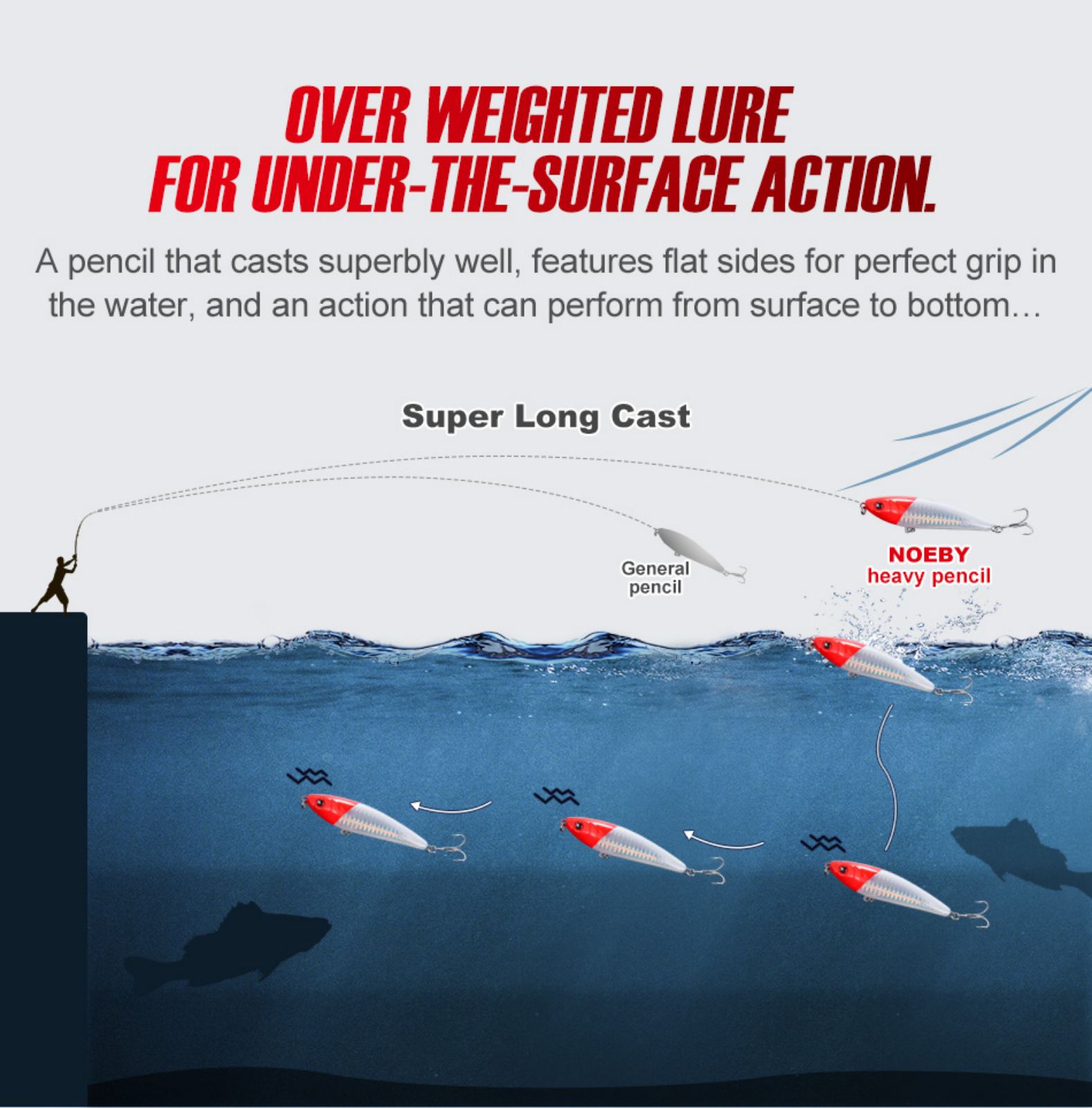 Νέο Sinking Pencil της εταιρείας NOEBY 95mm/25gr  μπορεί να πιάσει τις αποστάσεις ενός πλάνου αλλά με συμπεριφορά και κινήσεις που ένας πλάνος δεν μπορεί να κάνει. Μία από τις κινήσεις αυτές είναι κατά την ελεύθερη βύθιση του τεχνητού οπού εκτελεί σε οριζόντια θέση rolling όπως ακριβώς βυθίζεται ένα ετοιμοθάνατο και χτυπημένο μικρό ψάρι. To ιδιαίτερο σχήμα του κεφαλιού surface και το χαμηλό κέντρο βάρους του μας δίνουν την δυνατότητα για απίστευτα πολλές και διαφορετικές πλεύσεις, από αργή έως και γρήγορη ανάκτηση. Έτσι λοιπόν, το jerking και το skipping επιτυγχάνεται με μεγάλη ευκολία, προσελκύοντας όλα τα πελαγικά είδη ασχέτου μεγέθους!!