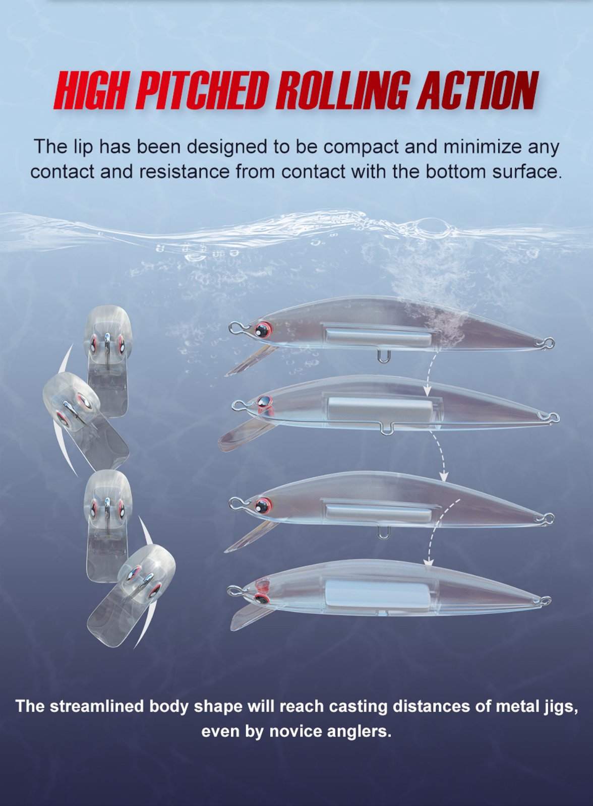 Ο ιδικός σχεδιασμός μύτης και γλώσσας θα μειώσουν την αντίσταση του νερού και θα δώσουν ισορροπημένη κίνηση στο τεχνητό παρομοιάζοντας με τραυματισμένο μικρόψαρο που θα προσελκύσει τους θηρευτές τις περιοχής που ψαρεύουμε.