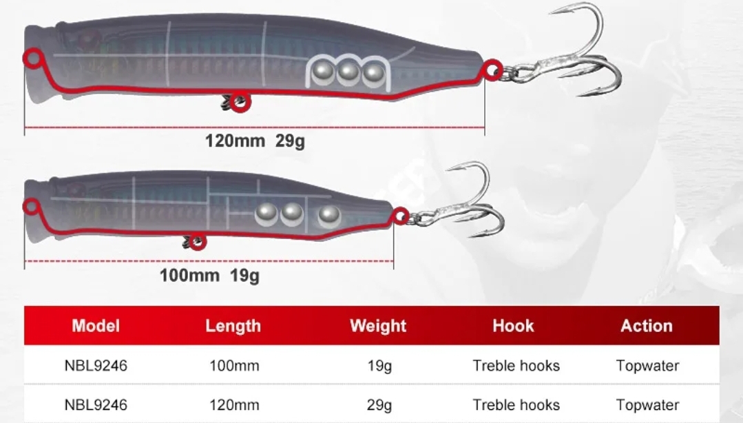 Η NOEBY έχει τοποθετήσει σε κάθετη διάταξη θαλάμους με σφαίρα, τεχνολογία. Το βάρος κινείται σε αριστερή – δεξιά κατεύθυνση, γύρω από τον θάλαμο και η κίνησή του δεν συγχρονίζεται ποτέ με το νερό, ακόμη και όταν παρασύρεται στα κύματα, επιτυγχάνοντας μια ακαθόριστη αλλά φυσική κίνηση, ακόμη και όταν απλά επιπλέει. Η σφαίρα βάρους μερικές φορές κινείται σαν εκκρεμές, μερικές φορές περιστρέφεται γύρω από έναν άξονα και προκαλεί ακανόνιστες ενέργειες που κάνουν τη συμπεριφορά του NOEBY TOP WATER POPPER να διαφέρει.