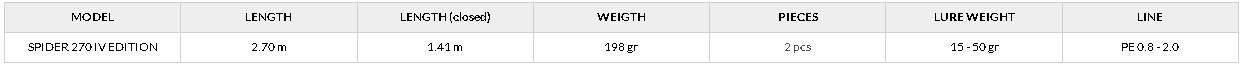 Το Spider IV είναι το νέο μοντέλο της σειράς Spider. Εντυπωσιάζει με εκπληκτικά χαρακτηριστικά του, αλλά και τα υψηλής ποιότητας περιφερειακά που διαθέτει. Το νέο Spider IV είναι ένα καλάμι spinning χαμηλού βάρους, με ασύγκριτη δύναμη και αντοχή, το οποίο σας επιτρέπει να πραγματοποιείτε μακρινές βολές ακριβείας χωρίς τη χρήση δύναμης. Στα περιφερειακά, η εταιρεία εξόπλισε το Spider IV με οδηγούς Fuji-K για σωστή διαχείριση του νήματος. O κορμός του είναι κατά 99% ενισχυμένος από ίνες γραφίτη και αποτελεί το χαρακτηριστικο που αυξάνει την αντοχή και τη δύναμη του blank. Με μήκος 2,70m και με lure weight 15-50gr είναι ικανό να κουράσει ένα μεγάλο αντίπαλο αλλά έχοντας παράλληλα την κατάλληλη ευαισθησία που χρειάζεται ώστε να χειριζόμαστε απόλυτα μεγάλα pencil, πλάνους και popper αλλά και υπερμεγέθη minnow.