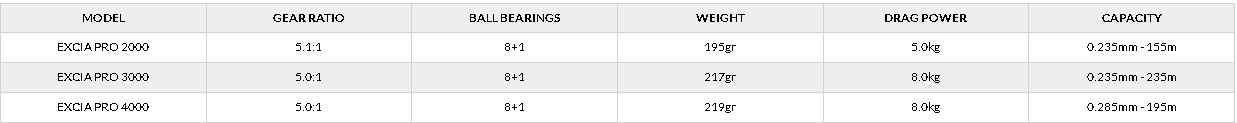 Οι Ryobi Excιa Pro είναι μια ολοκαίνουργια σειρά μηχανισμών που χαρακτηρίζεται από χαμηλό βάρος σε συνδυασμό με επαρκή δύναμη και έχει σχεδιαστεί για light και ultralight τεχνικές με ελαφρύ εξοπλισμό. Η ελαφριά μπομπίνα, με μεταλλικό κλιπ και νέο σύστημα φρένων σύγχρονου σχεδιασμού, προσφέρει απόλυτη ακρίβεια και αξιοπιστία σε κάθε μάχη. Διαθέτει στιβαρή μανιβέλα η οποία βιδώνει απευθείας στο γρανάζι κίνησης για μέγιστη δύναμη και λαβή EVA για καλύτερο κράτημα. Το νέο ελαφρύ σώμα και ο ρότορας είναι κατασκευασμένα από NCRT carbon. Για την κατασκευή πολλών μεταλλικών εξαρτημάτων χρησιμοποιείται ευρέως ένα ελαφρύ και ανθεκτικό κράμα αλουμινίου, το οποίο διαθέτει υπερ-ανθεκτική επίστρωση και ελάχιστη τριβή. Ο μηχανισμός διαθέτει ένα ολοκαίνουργιο σύστημα μετάδοσης ισχύος. Το κύριο γρανάζι στηρίζεται σε 4 ρουλεμάν αυξημένου μεγέθους. Ένας ατέρμονας κοχλίας εξασφαλίζει ποιοτική τοποθέτηση της πετονιάς. Η μανιβέλα ισχύος βιδώνει απευθείας στο γρανάζι κίνησης και διαθέτει πρακτική αναδιπλούμενη λαβή. Ο συνολικός αριθμός ρουλεμάν είναι 8+1. Η ελαφριά μπομπίνα διαθέτει μεταλλικό κλιπ και νέο σύστημα φρένων σύγχρονου σχεδιασμού, το οποίο εκτελεί άψογα τις λειτουργίες του.