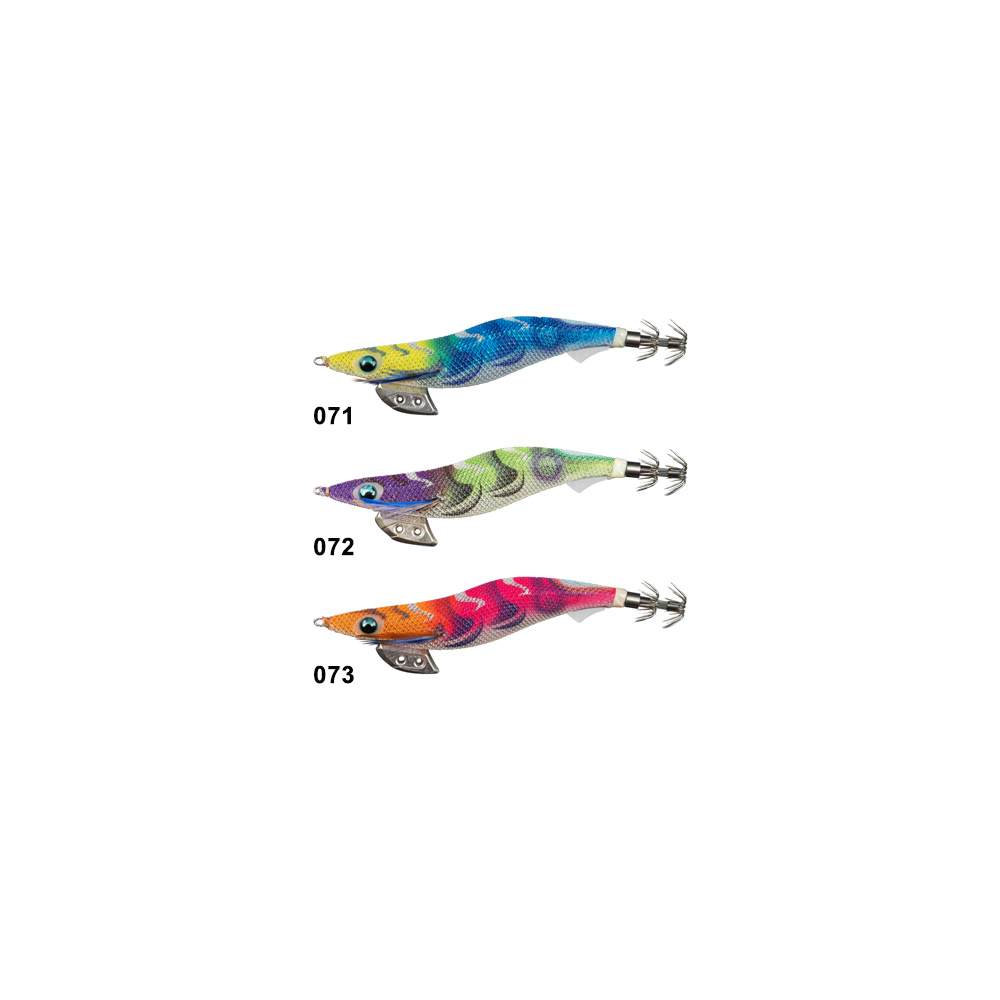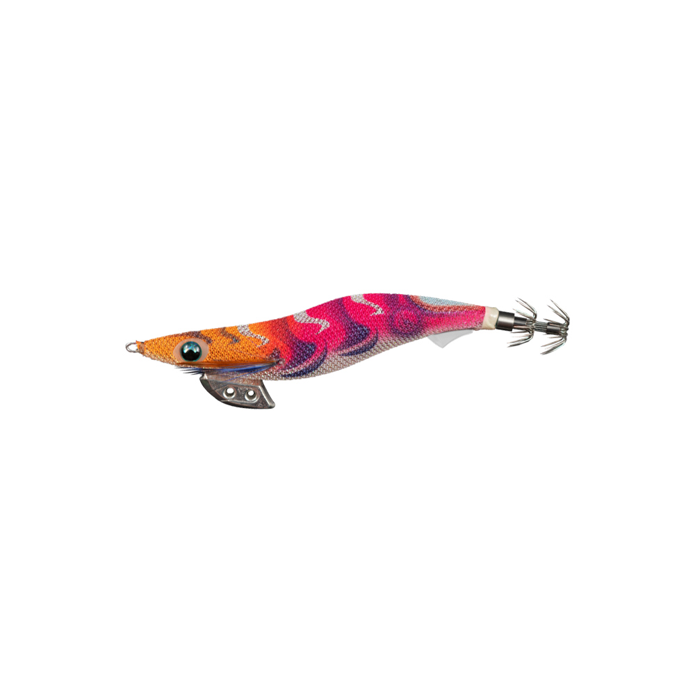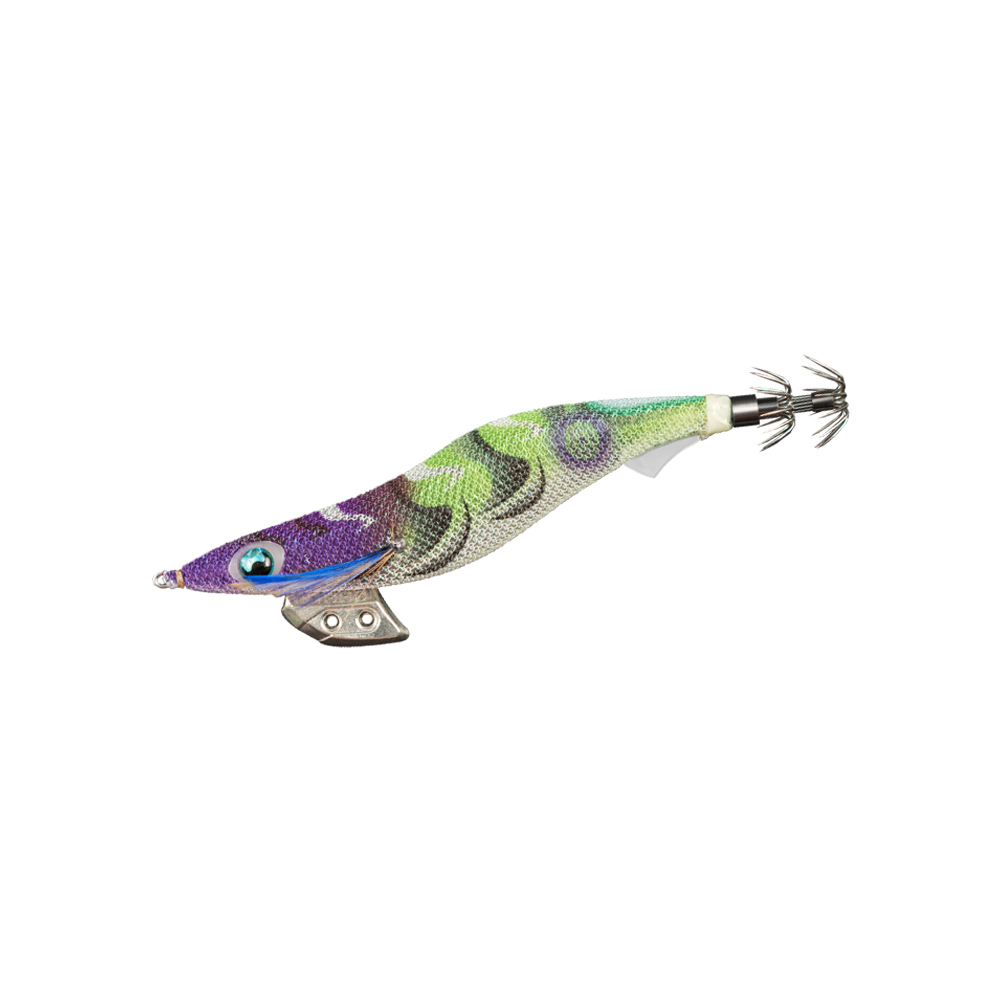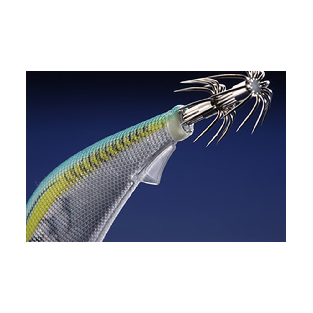 Year by year, the numbers of EGING angler is increasing because of that popularity. On the other hand, the numbers of very cautious squid are also increasing. They tend to watch EGI (color, action and sinking balance) cautiously before attack and bite. It makes anglers difficult to catch squid. EGI-OH K has many function to attract the cautious squid. EGI-OH K was developed to capture the rough and tough condition. (1) Minimizing the effects of external factors such as wind and waves, and ensuring a stable fall. (2) It has a darting action that does not darting too much than necessary, which is a favorite action of cautious squid. Attached “HYDRO FIN” at the rear of the jig for improved stability when sinking. “HYDRO FIN” acts like a ship’s rudder. Low activity squid dislike the EGI that has an unstable sink. Under bad conditions such as strong wind and high waves, squid jigs sink unstably. EGI-OH K with “HYDRO FIN” specialize in a having a stable sink in any condition. Flat eyes with Keimura pupil and 490GLOW edge. Pentagon body design, the belly of jig is flat design. Receive the water resistance on a flat surface. Environmentally friendly TIN material sinker with tuning holes for adding or reducing weight. Shallow type and Super Shallow type have different cloth pattern. Balancer sinker has attached on root part of crown hook, it makes EGI great balance with keeping good action and Blue eyes and Blue feather.