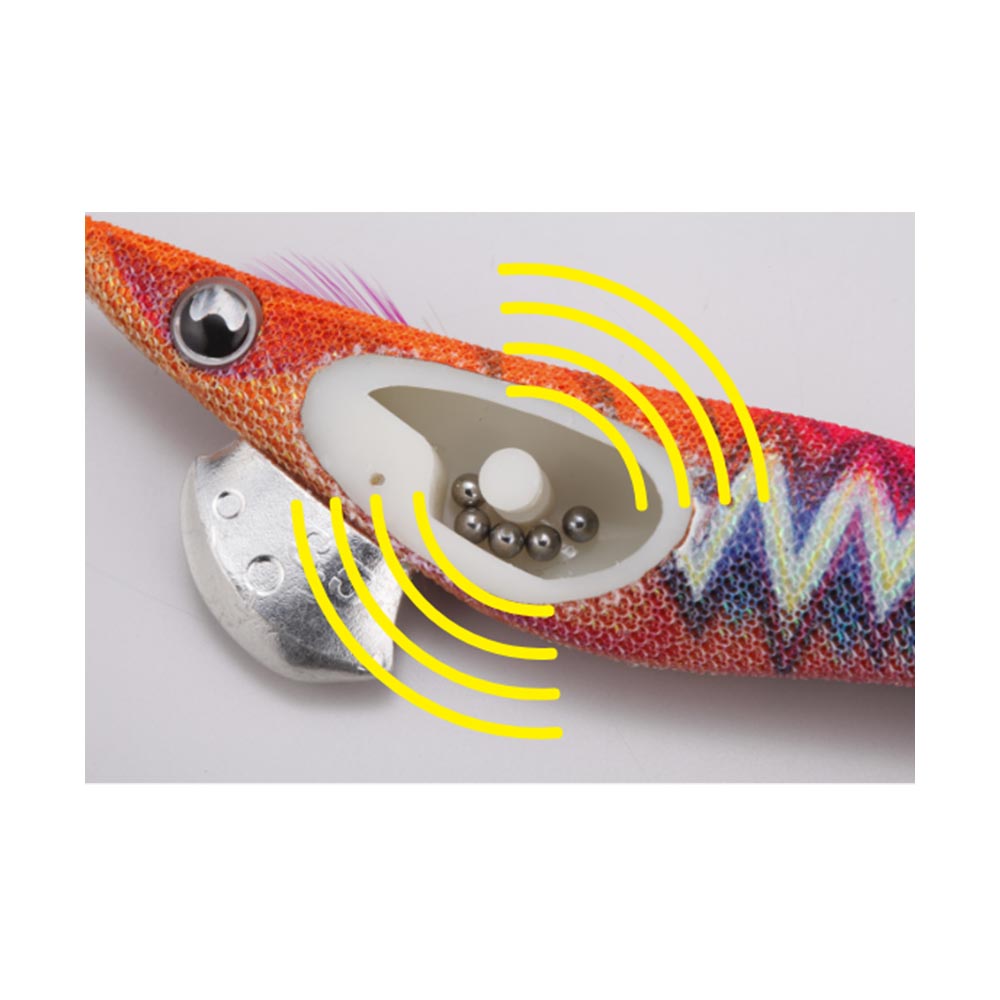 High appeal model of EGI-OH series. There are elements that attract high activity squid. “SEARCH RATTLE” is one of the YAMASHITA’s exclusive technology. The YAMASHITA “SEARCH” squid jigs feature a number of unique features but what sets this jig apart is the 600Hz rattle inside the body. YAMASHITA have discovered after much research with a leading Japanese University that squid can pick up sounds between 400Hz and 1,500Hz with 600Hz being the optimum level for squid to be most interested. For many years squid anglers all over the world have used jigs equipped with glow material. Now, research shows the best wavelength of visible light squid is 490nm. This is a tuned glow of 490nm which YAMASHITA discovered with the research from a leading Japanese university is the best glow colour for the squids eyes to detect. “Glow of 490nm wavelength is most perceivable for squid.” While keeping the quick dart action of EGI-OH LIVE, the sinking speed is designed to be a little bit faster than the LIVE (without Rattle), so that it can quickly search for high activity squ